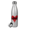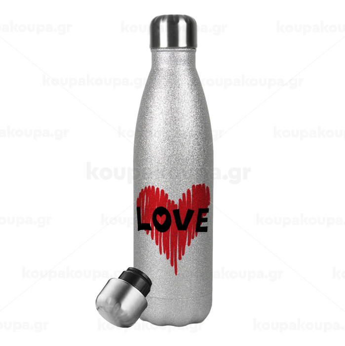 I Love You red heart, Μεταλλικό παγούρι θερμός Glitter Aσημένιο (Stainless steel), διπλού τοιχώματος, 500ml