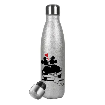 Love Car, Μεταλλικό παγούρι θερμός Glitter Aσημένιο (Stainless steel), διπλού τοιχώματος, 500ml