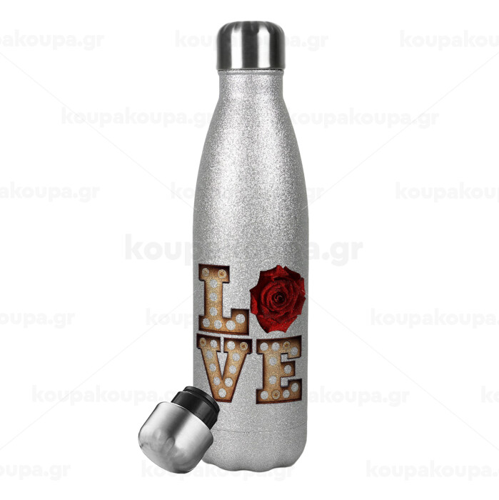 Love lights and roses, Μεταλλικό παγούρι θερμός Glitter Aσημένιο (Stainless steel), διπλού τοιχώματος, 500ml