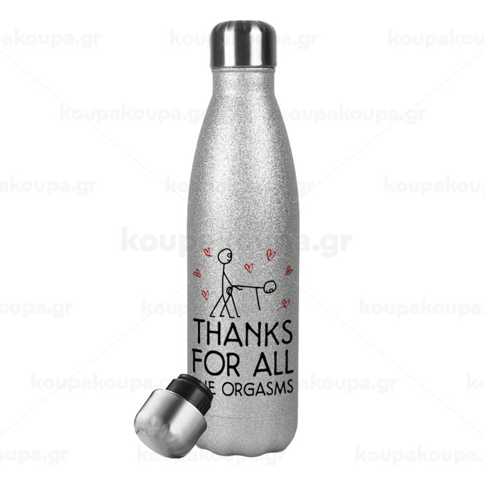 Thanks for all the orgasms, Μεταλλικό παγούρι θερμός Glitter Aσημένιο (Stainless steel), διπλού τοιχώματος, 500ml