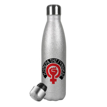 Ημέρα της γυναίκας, Μεταλλικό παγούρι θερμός Glitter Aσημένιο (Stainless steel), διπλού τοιχώματος, 500ml