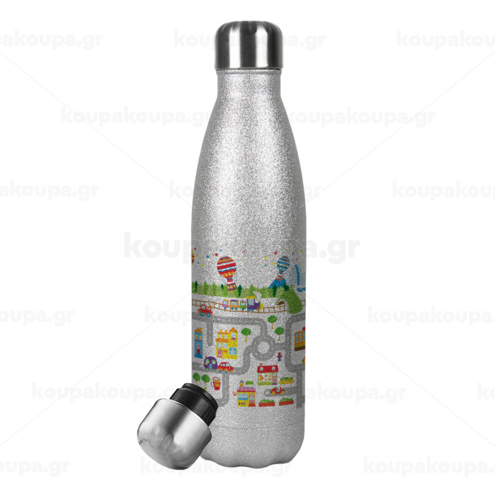 City road track maps, Μεταλλικό παγούρι θερμός Glitter Aσημένιο (Stainless steel), διπλού τοιχώματος, 500ml