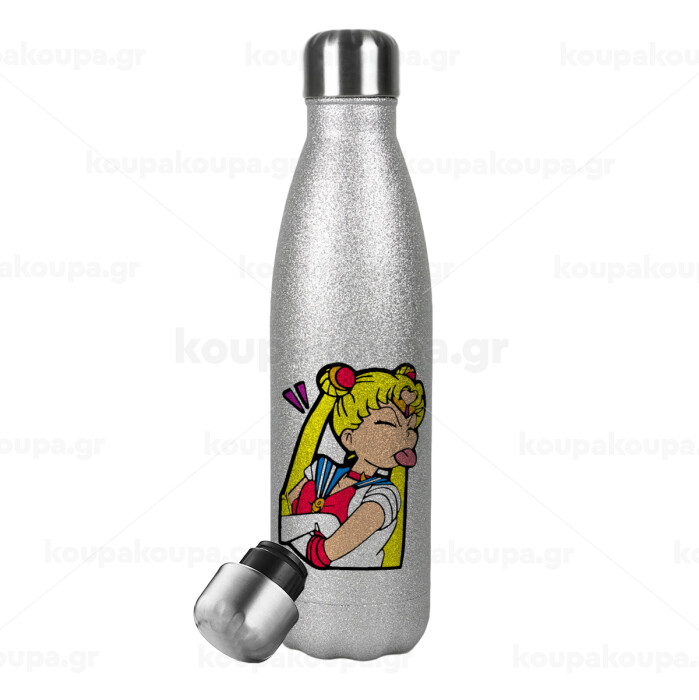Sailor Moon, Μεταλλικό παγούρι θερμός Glitter Aσημένιο (Stainless steel), διπλού τοιχώματος, 500ml