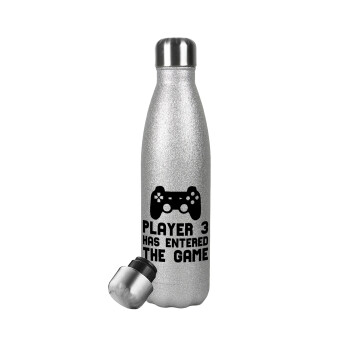 BABY, MOMMY, DADDY Low battery, Μεταλλικό παγούρι θερμός Glitter Aσημένιο (Stainless steel), διπλού τοιχώματος, 500ml