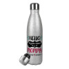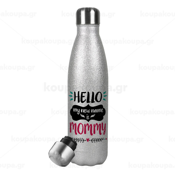 Hello, my new name is Mommy, Μεταλλικό παγούρι θερμός Glitter Aσημένιο (Stainless steel), διπλού τοιχώματος, 500ml