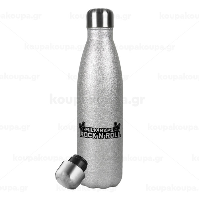 Milk, Naps, Rock N Roll, Μεταλλικό παγούρι θερμός Glitter Aσημένιο (Stainless steel), διπλού τοιχώματος, 500ml