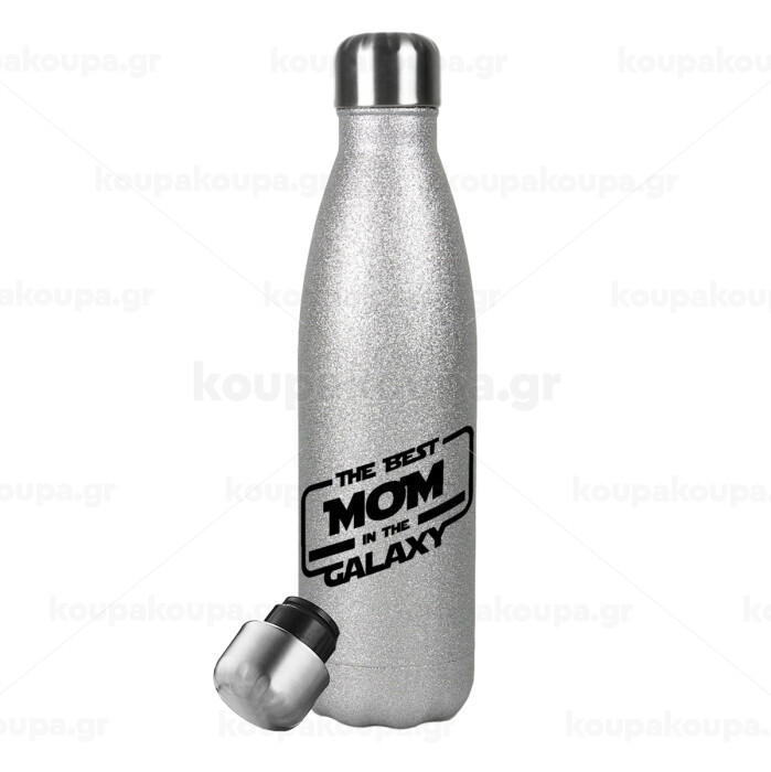The Best MOM in the Galaxy, Μεταλλικό παγούρι θερμός Glitter Aσημένιο (Stainless steel), διπλού τοιχώματος, 500ml