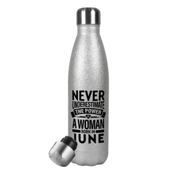 Never Underestimate the poer of a Woman born in..., Μεταλλικό παγούρι θερμός Glitter Aσημένιο (Stainless steel), διπλού τοιχώματος, 500ml