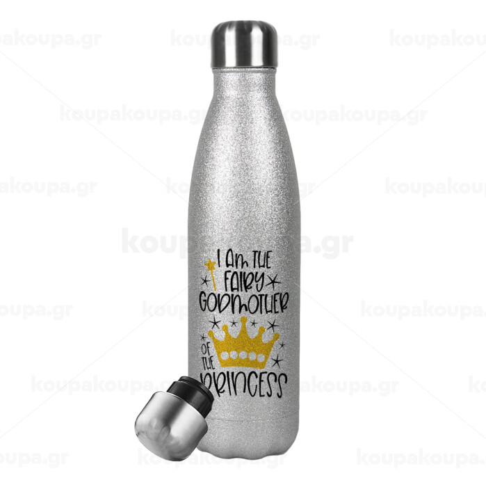 I am the fairy Godmother of the Princess, Μεταλλικό παγούρι θερμός Glitter Aσημένιο (Stainless steel), διπλού τοιχώματος, 500ml