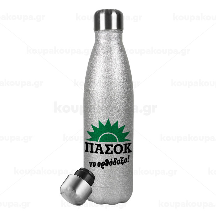 ΠΑΣΟΚ το ορθόδοξο, Μεταλλικό παγούρι θερμός Glitter Aσημένιο (Stainless steel), διπλού τοιχώματος, 500ml