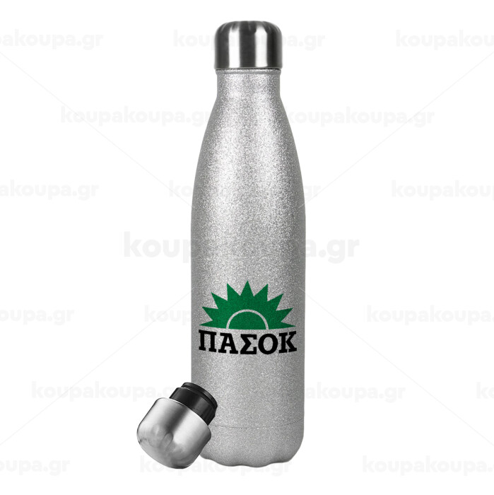 ΠΑΣΟΚ, Μεταλλικό παγούρι θερμός Glitter Aσημένιο (Stainless steel), διπλού τοιχώματος, 500ml