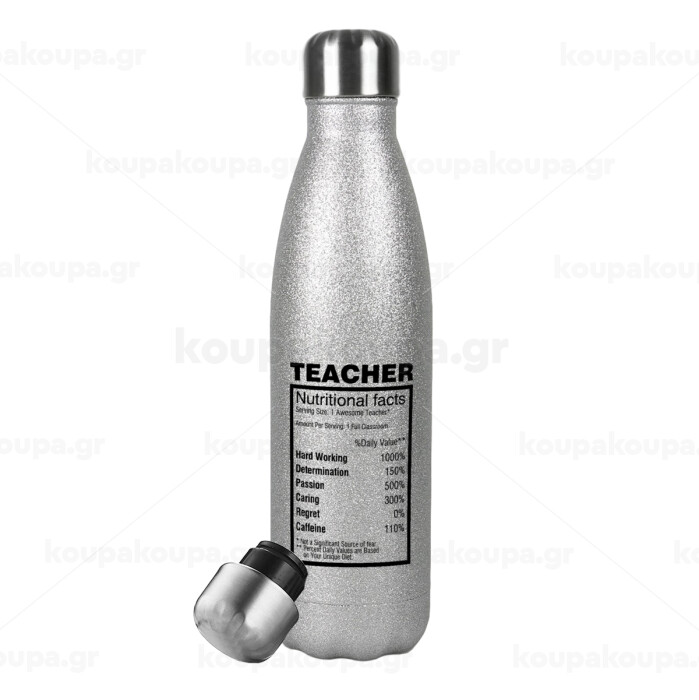 Τα συστατικά του δασκάλου, Μεταλλικό παγούρι θερμός Glitter Aσημένιο (Stainless steel), διπλού τοιχώματος, 500ml