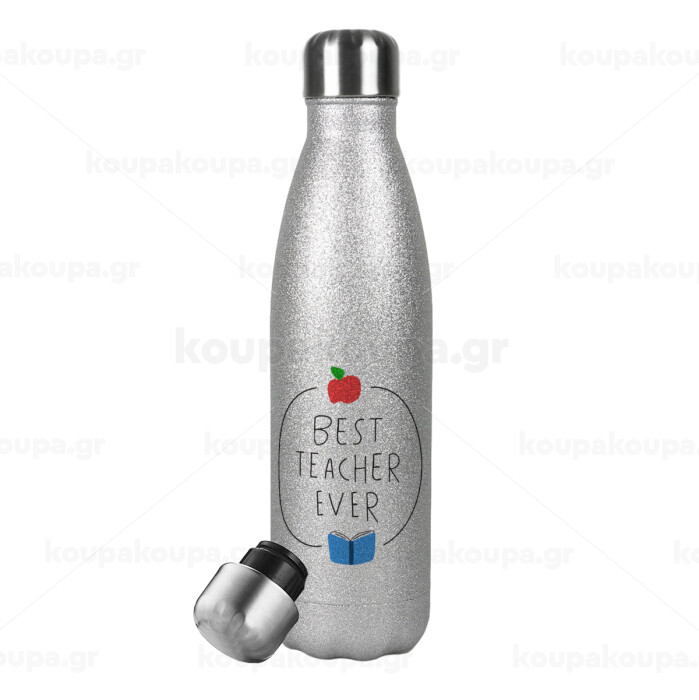 Best teacher ever, Μεταλλικό παγούρι θερμός Glitter Aσημένιο (Stainless steel), διπλού τοιχώματος, 500ml