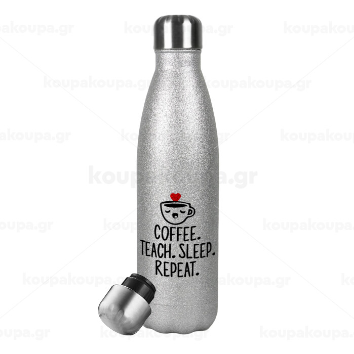 Coffee Teach Sleep Repeat, Μεταλλικό παγούρι θερμός Glitter Aσημένιο (Stainless steel), διπλού τοιχώματος, 500ml