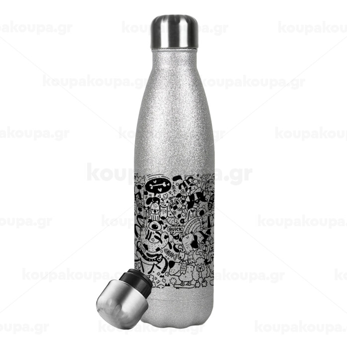 Σκυλάκια, Μεταλλικό παγούρι θερμός Glitter Aσημένιο (Stainless steel), διπλού τοιχώματος, 500ml