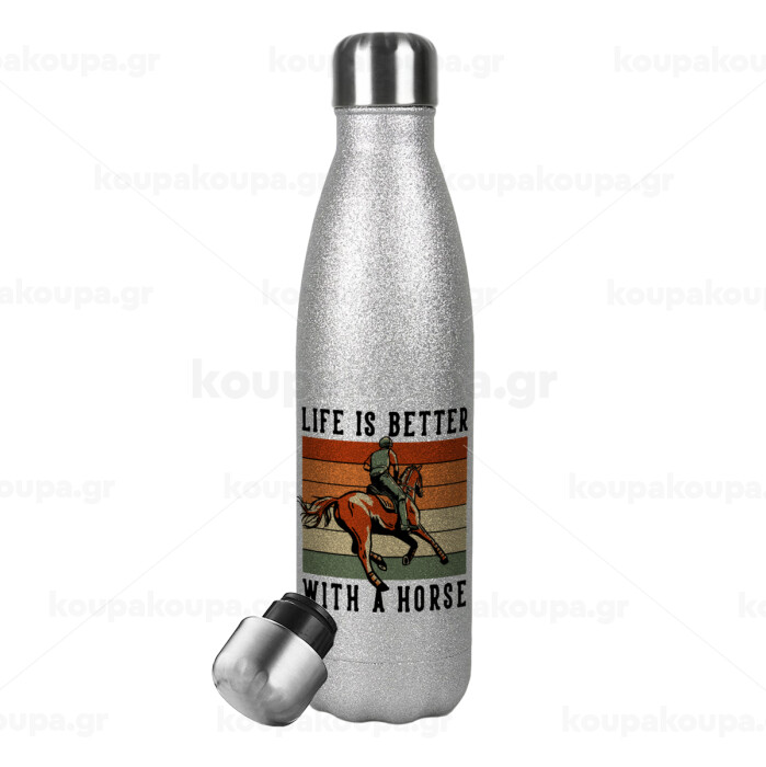 Life is Better with a Horse, Μεταλλικό παγούρι θερμός Glitter Aσημένιο (Stainless steel), διπλού τοιχώματος, 500ml