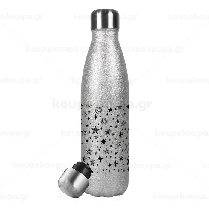 Doodle Stars, Μεταλλικό παγούρι θερμός Glitter Aσημένιο (Stainless steel), διπλού τοιχώματος, 500ml