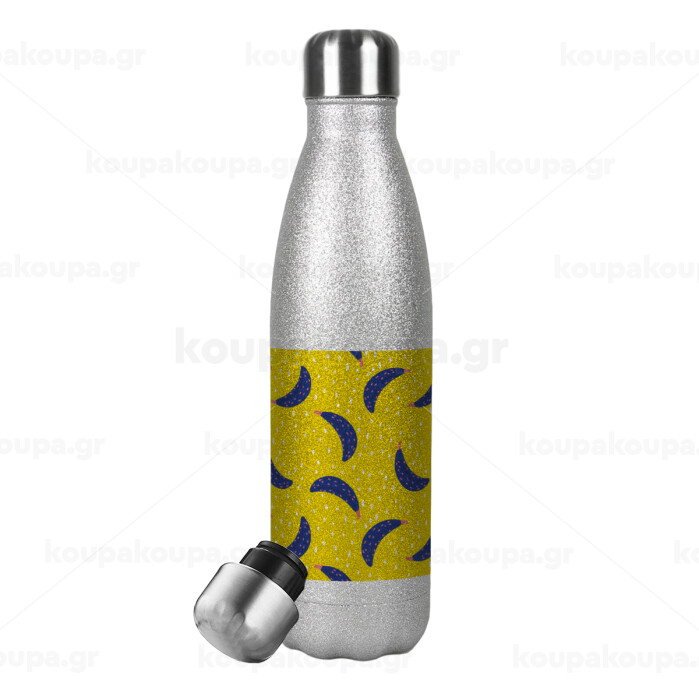 Yellow seamless with blue bananas, Μεταλλικό παγούρι θερμός Glitter Aσημένιο (Stainless steel), διπλού τοιχώματος, 500ml