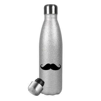 Μουστάκι, Μεταλλικό παγούρι θερμός Glitter Aσημένιο (Stainless steel), διπλού τοιχώματος, 500ml