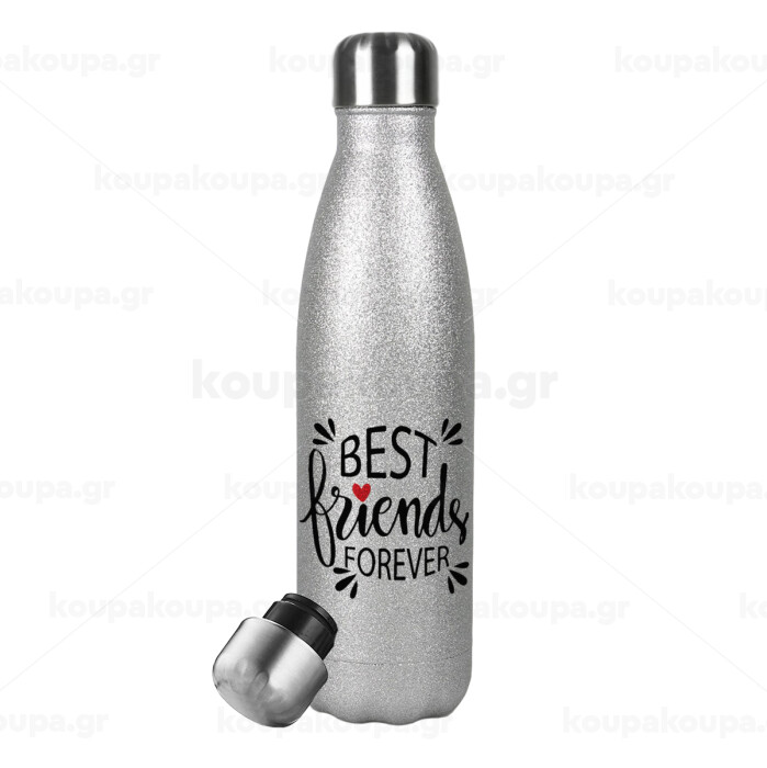 Best Friends forever, Μεταλλικό παγούρι θερμός Glitter Aσημένιο (Stainless steel), διπλού τοιχώματος, 500ml