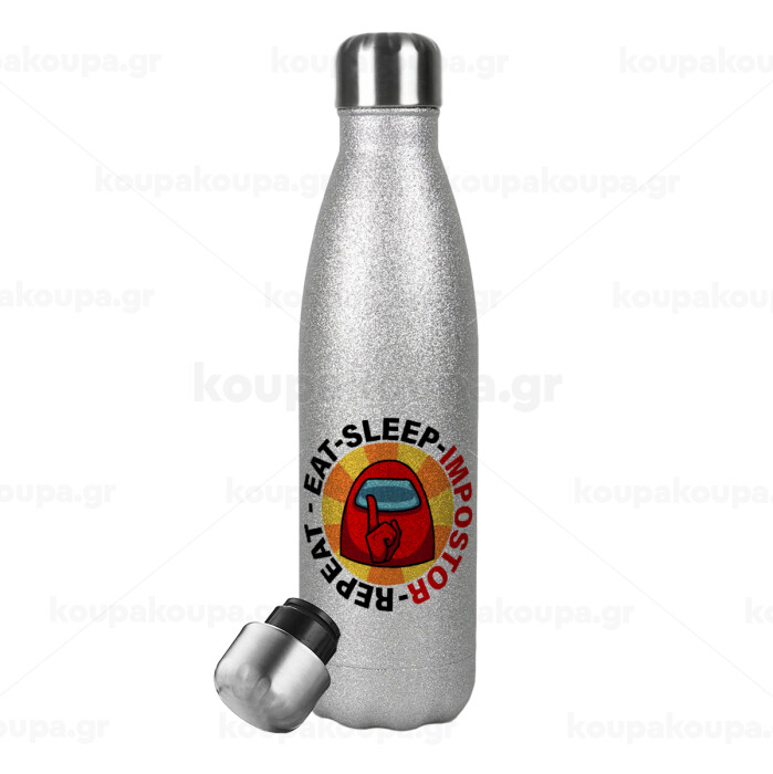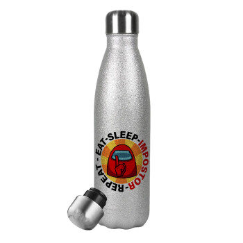 Among US Eat Sleep Repeat Impostor, Μεταλλικό παγούρι θερμός Glitter Aσημένιο (Stainless steel), διπλού τοιχώματος, 500ml