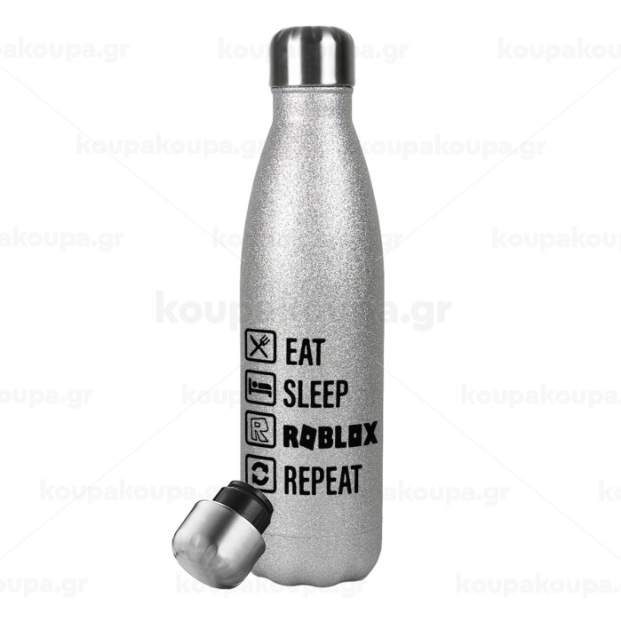 Eat, Sleep, Roblox, Repeat, Μεταλλικό παγούρι θερμός Glitter Aσημένιο (Stainless steel), διπλού τοιχώματος, 500ml