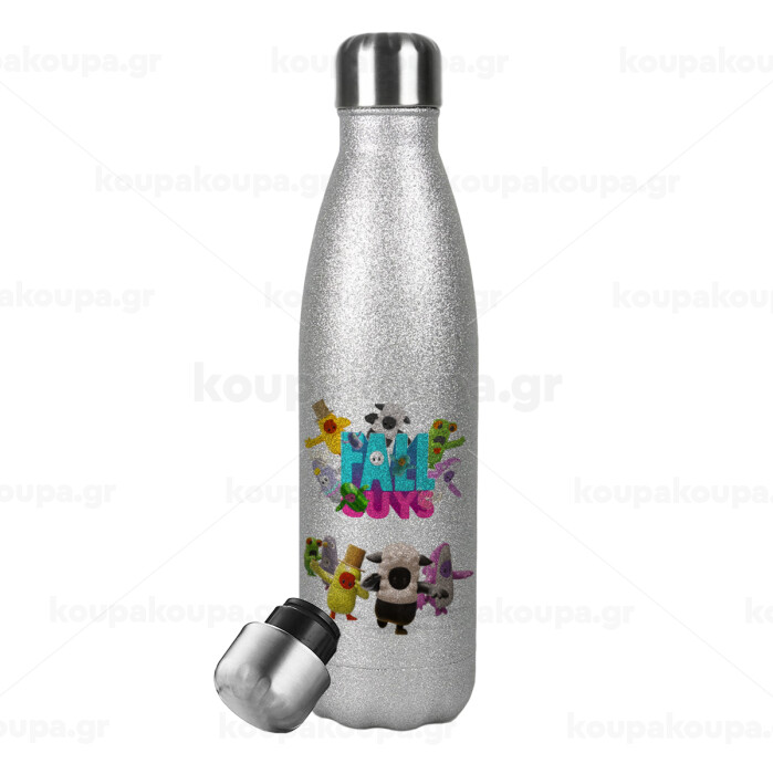 FALL GUYS, Μεταλλικό παγούρι θερμός Glitter Aσημένιο (Stainless steel), διπλού τοιχώματος, 500ml