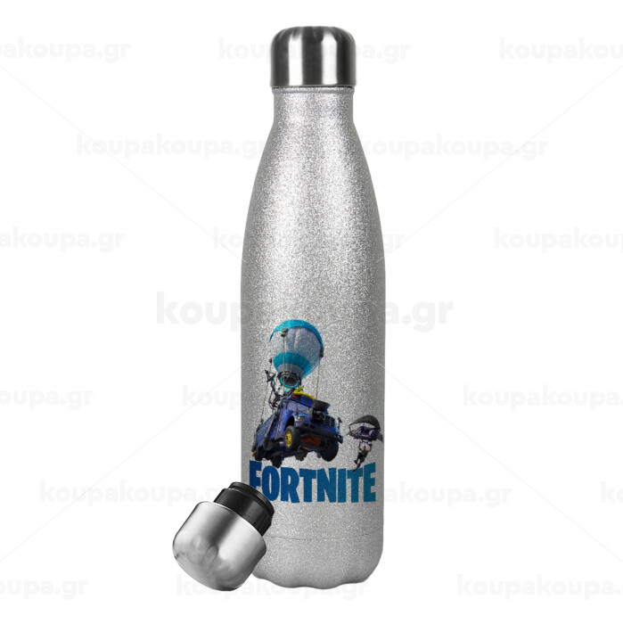 Fortnite Bus, Μεταλλικό παγούρι θερμός Glitter Aσημένιο (Stainless steel), διπλού τοιχώματος, 500ml