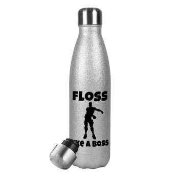 Fortnite Floss Like a Boss, Μεταλλικό παγούρι θερμός Glitter Aσημένιο (Stainless steel), διπλού τοιχώματος, 500ml