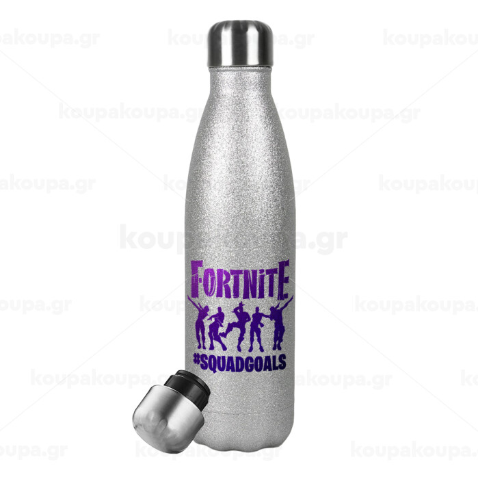 Fortnite #squadgoals, Μεταλλικό παγούρι θερμός Glitter Aσημένιο (Stainless steel), διπλού τοιχώματος, 500ml