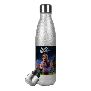 Hello Neighbor, Μεταλλικό παγούρι θερμός Glitter Aσημένιο (Stainless steel), διπλού τοιχώματος, 500ml