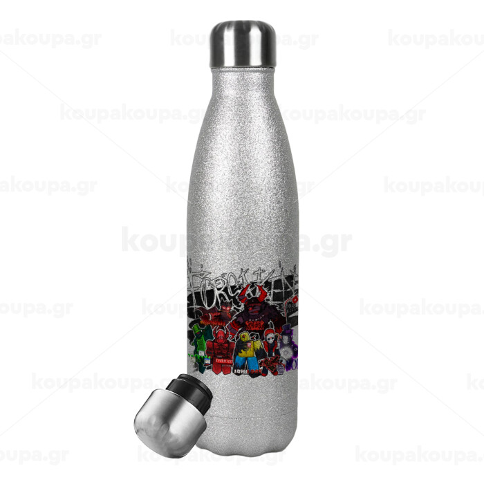 Roblox Forsaken, Μεταλλικό παγούρι θερμός Glitter Aσημένιο (Stainless steel), διπλού τοιχώματος, 500ml