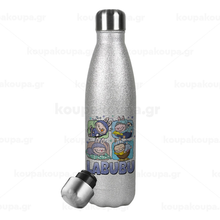 Labubu, Μεταλλικό παγούρι θερμός Glitter Aσημένιο (Stainless steel), διπλού τοιχώματος, 500ml