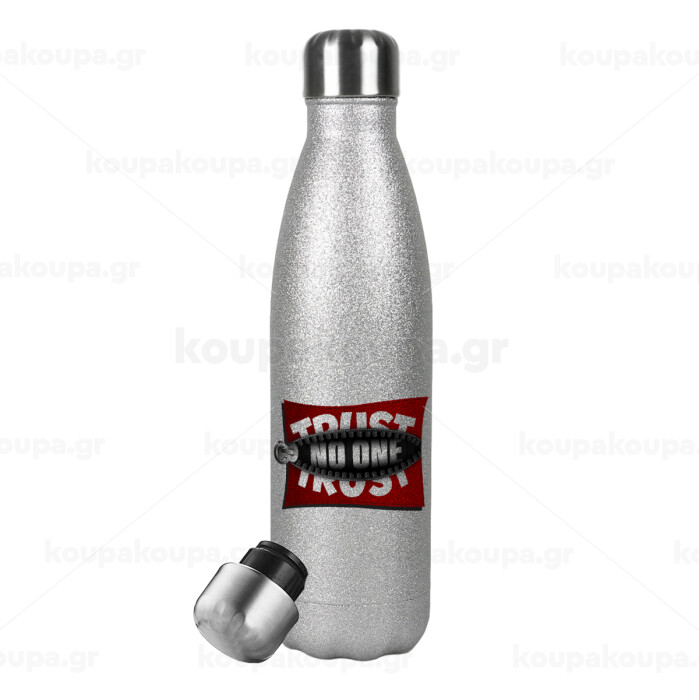 Trust no one... (zipper), Μεταλλικό παγούρι θερμός Glitter Aσημένιο (Stainless steel), διπλού τοιχώματος, 500ml