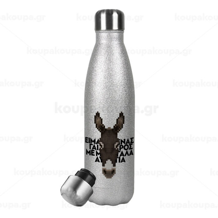 Είμαι ένας γάιδαρος με μεγάλα αυτιά., Μεταλλικό παγούρι θερμός Glitter Aσημένιο (Stainless steel), διπλού τοιχώματος, 500ml