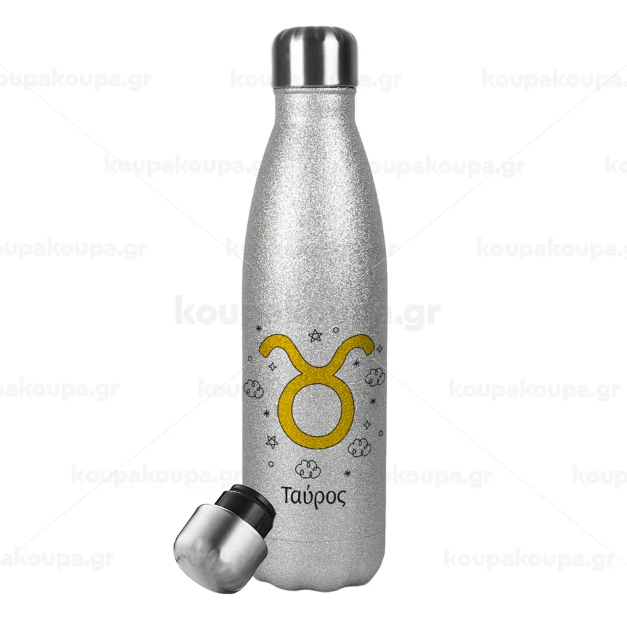 Ζώδια Ταύρος, Μεταλλικό παγούρι θερμός Glitter Aσημένιο (Stainless steel), διπλού τοιχώματος, 500ml