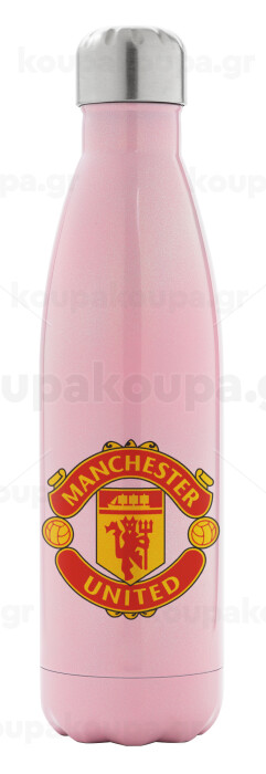 Manchester United F.C., Μεταλλικό παγούρι θερμός Ροζ Ιριδίζον (Stainless steel), διπλού τοιχώματος, 500ml