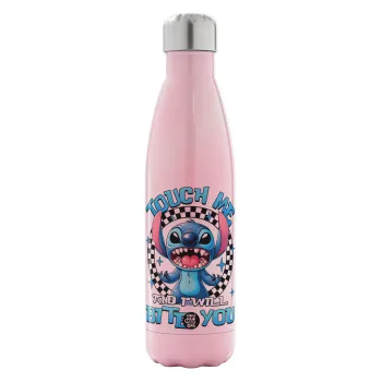 Stitch Touch Me And I Will Bite You, Μεταλλικό παγούρι θερμός Ροζ Ιριδίζον (Stainless steel), διπλού τοιχώματος, 500ml