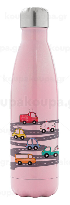 Hand drawn childish set with cars, Μεταλλικό παγούρι θερμός Ροζ Ιριδίζον (Stainless steel), διπλού τοιχώματος, 500ml