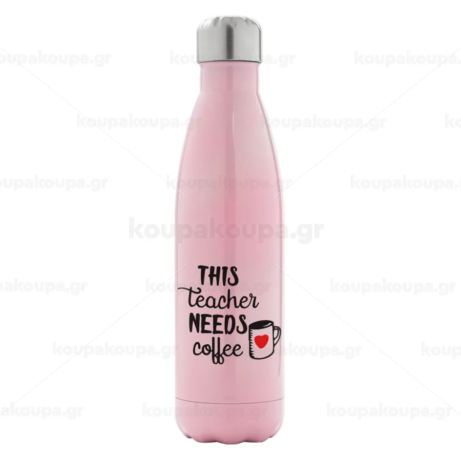 Τhis teacher needs coffee, Μεταλλικό παγούρι θερμός Ροζ Ιριδίζον (Stainless steel), διπλού τοιχώματος, 500ml