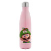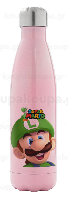 Super mario Luigi, Μεταλλικό παγούρι θερμός Ροζ Ιριδίζον (Stainless steel), διπλού τοιχώματος, 500ml