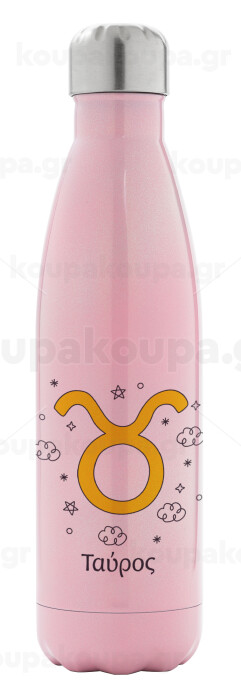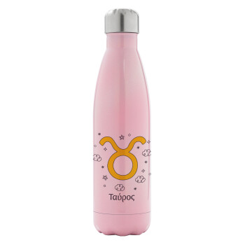 Ζώδια Ταύρος, Μεταλλικό παγούρι θερμός Ροζ Ιριδίζον (Stainless steel), διπλού τοιχώματος, 500ml
