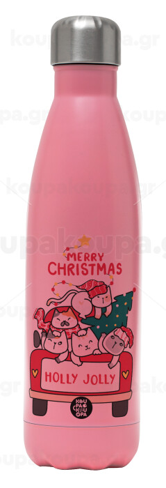 Merry Christmas cats in car, Μεταλλικό παγούρι θερμός Ροζ Ματ (Stainless steel), διπλού τοιχώματος, 500ml