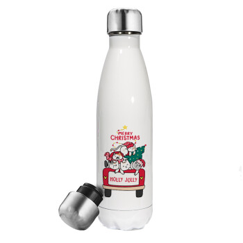 Merry Christmas cats in car, Μεταλλικό παγούρι θερμός Λευκό (Stainless steel), διπλού τοιχώματος, 500ml