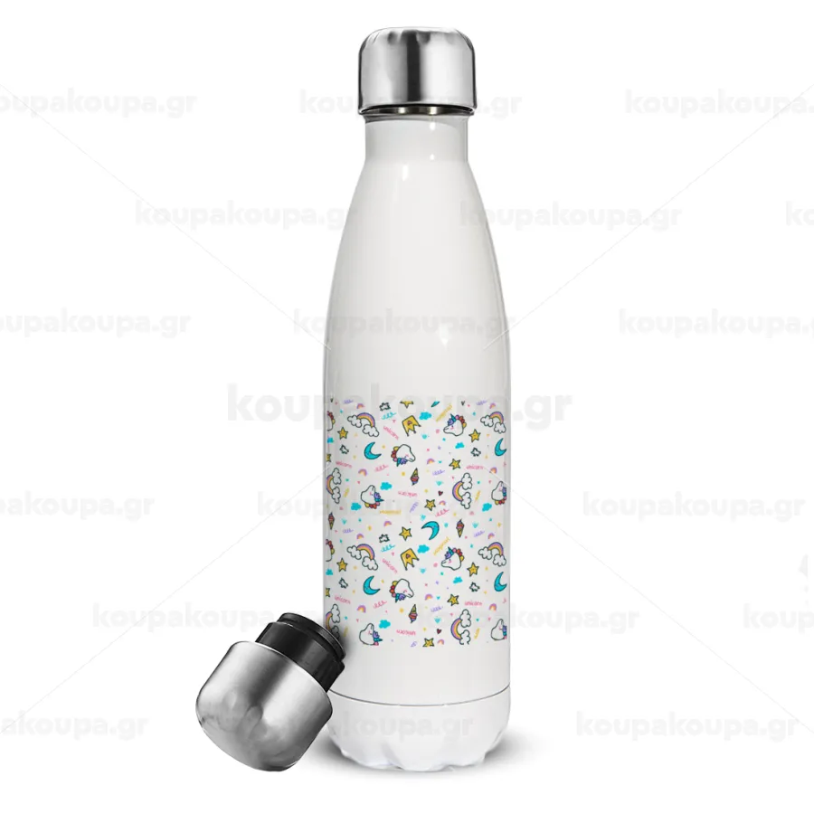Unicorn pattern white, Μεταλλικό παγούρι θερμός Λευκό (Stainless steel), διπλού τοιχώματος, 500ml