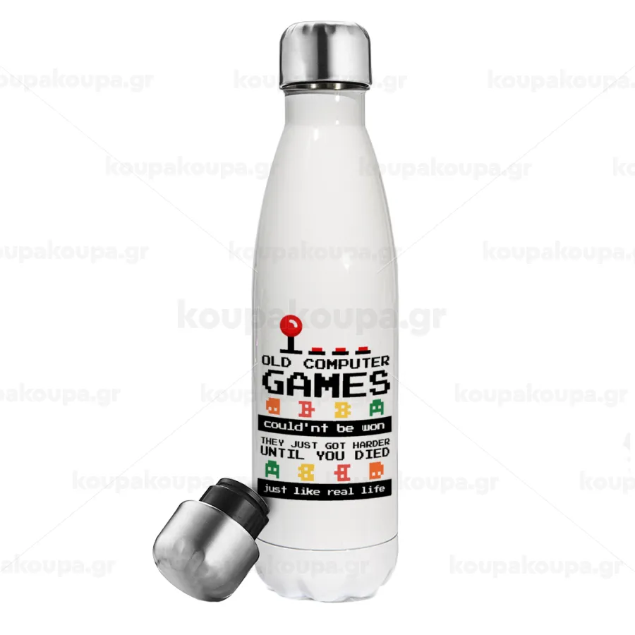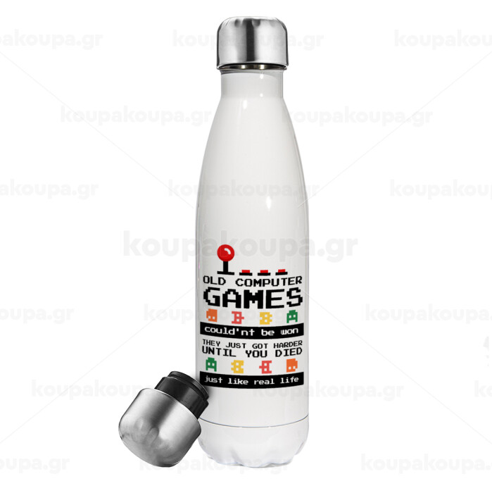 OLD computer games couldn't be won just like real life!, Μεταλλικό παγούρι θερμός Λευκό (Stainless steel), διπλού τοιχώματος, 500ml