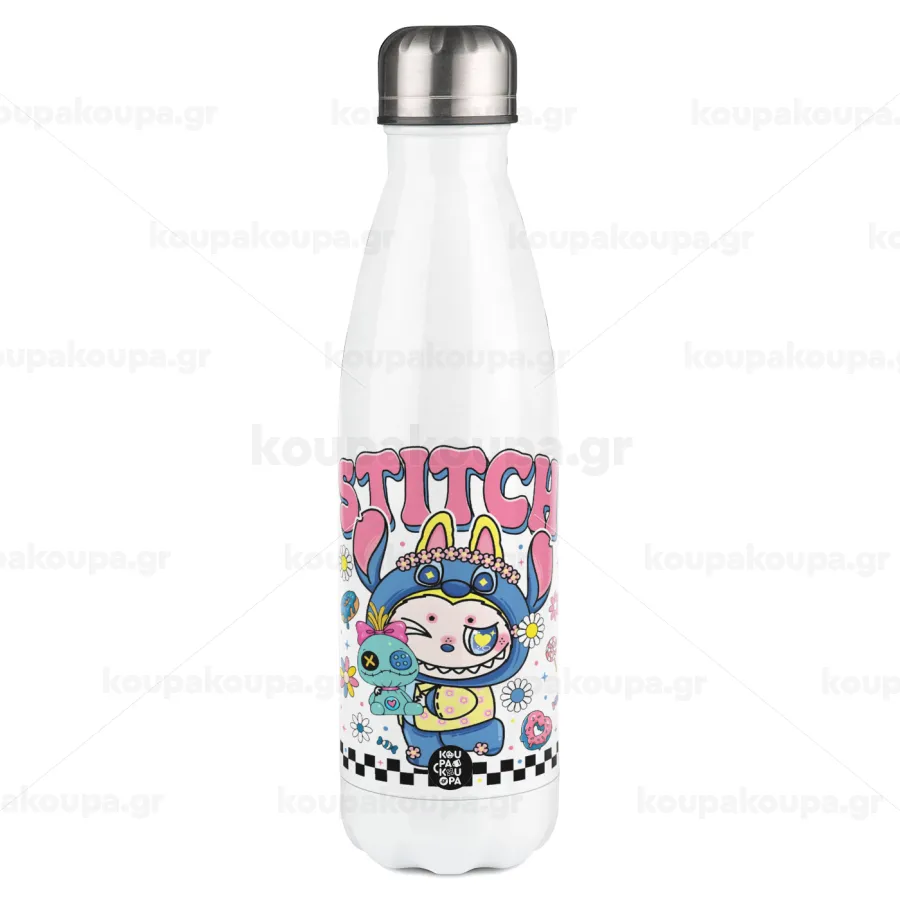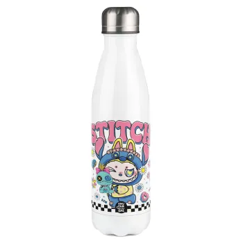Labubu Stitch, Μεταλλικό παγούρι θερμός Λευκό (Stainless steel), διπλού τοιχώματος, 500ml