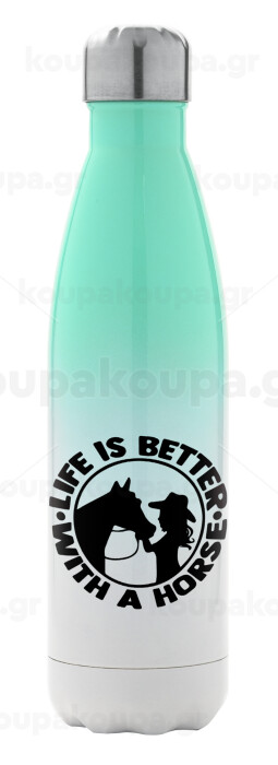 Life is Better with a Horse, Μεταλλικό παγούρι θερμός Πράσινο/Λευκό (Stainless steel), διπλού τοιχώματος, 500ml