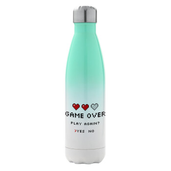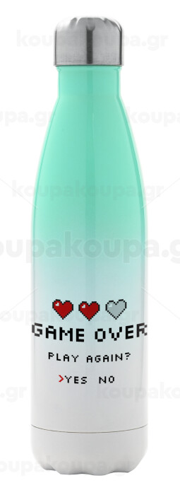 GAME OVER, Play again? YES - NO, Μεταλλικό παγούρι θερμός Πράσινο/Λευκό (Stainless steel), διπλού τοιχώματος, 500ml
