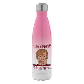 home alone, Merry Christmas ya filthy animal, Μεταλλικό παγούρι θερμός Ροζ/Λευκό (Stainless steel), διπλού τοιχώματος, 500ml
